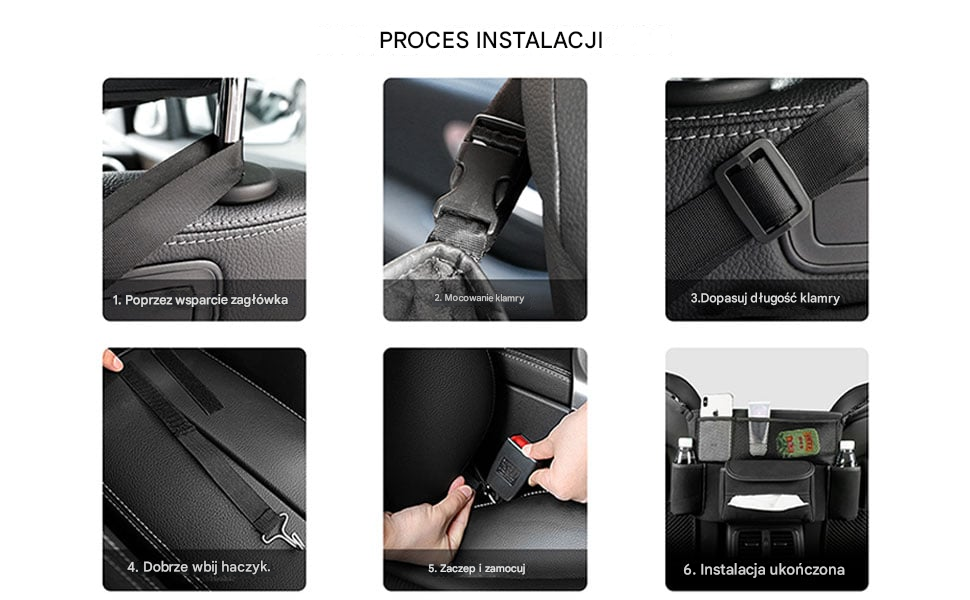 Montaż tego uchwytu na torebkę jest bardzo prosty, nie wymaga wiercenia ani naklejek, jest prosty i łatwy w instalacji, zajmuje mniej niż minutę dzięki regulowanej elastycznej lince o wystarczającej długości, 2 na górze i 1 na dole, przeciągniętej przez podłokietnik konsoli.